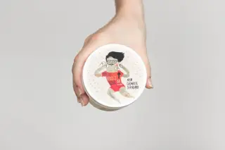 Những miếng bông tẩy tế bào chết được đựng trong hộp nhựa màu trắng với những họa tiết hình người nổi bật